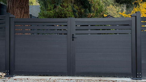 NeoLine Composite Fencing's gate solution is designed to elevate both the security and visual appeal of your outdoor space. Crafted with meticulous attention to detail, the gates feature sleek black or silver aluminum frames for a sophisticated and modern finish, perfectly matching the composite boards used in the panels. NeoLine's dedication to quality craftsmanship is evident in every aspect, from the robust lock mechanism to the precision-engineered hinges, ensuring a secure and durable gate that seamlessly complements the overall aesthetics of the composite fencing, providing both style and peace of mind for your property.